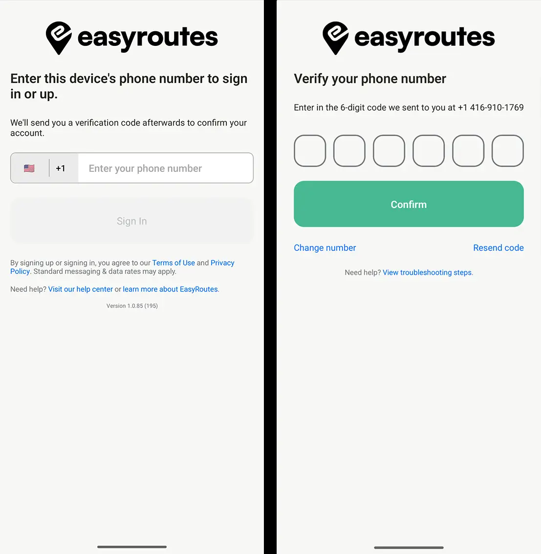 If you've been invited to deliver by a shop using EasyRoutes, first download EasyRoutes Delivery Driver for iOS from the App Store, or for Android from the Google Play Store. When you open EasyRoutes initially, you'll be presented with a screen where you can enter your device's phone number to sign in or sign up for EasyRoutes Delivery Driver (below, left); once you've done that, we'll send a confirmation code via SMS to the number you entered - input that code on the following screen (below, right):