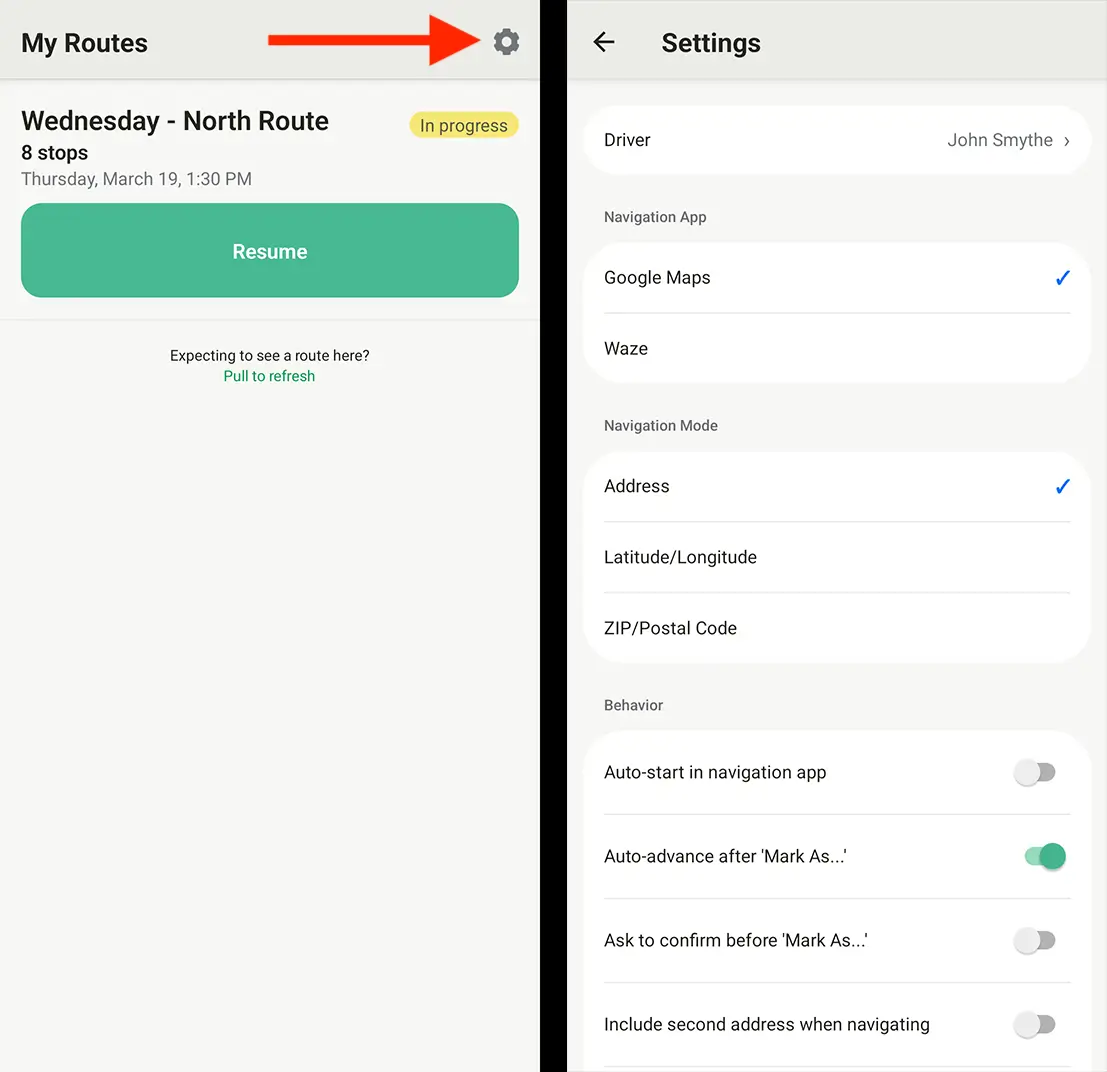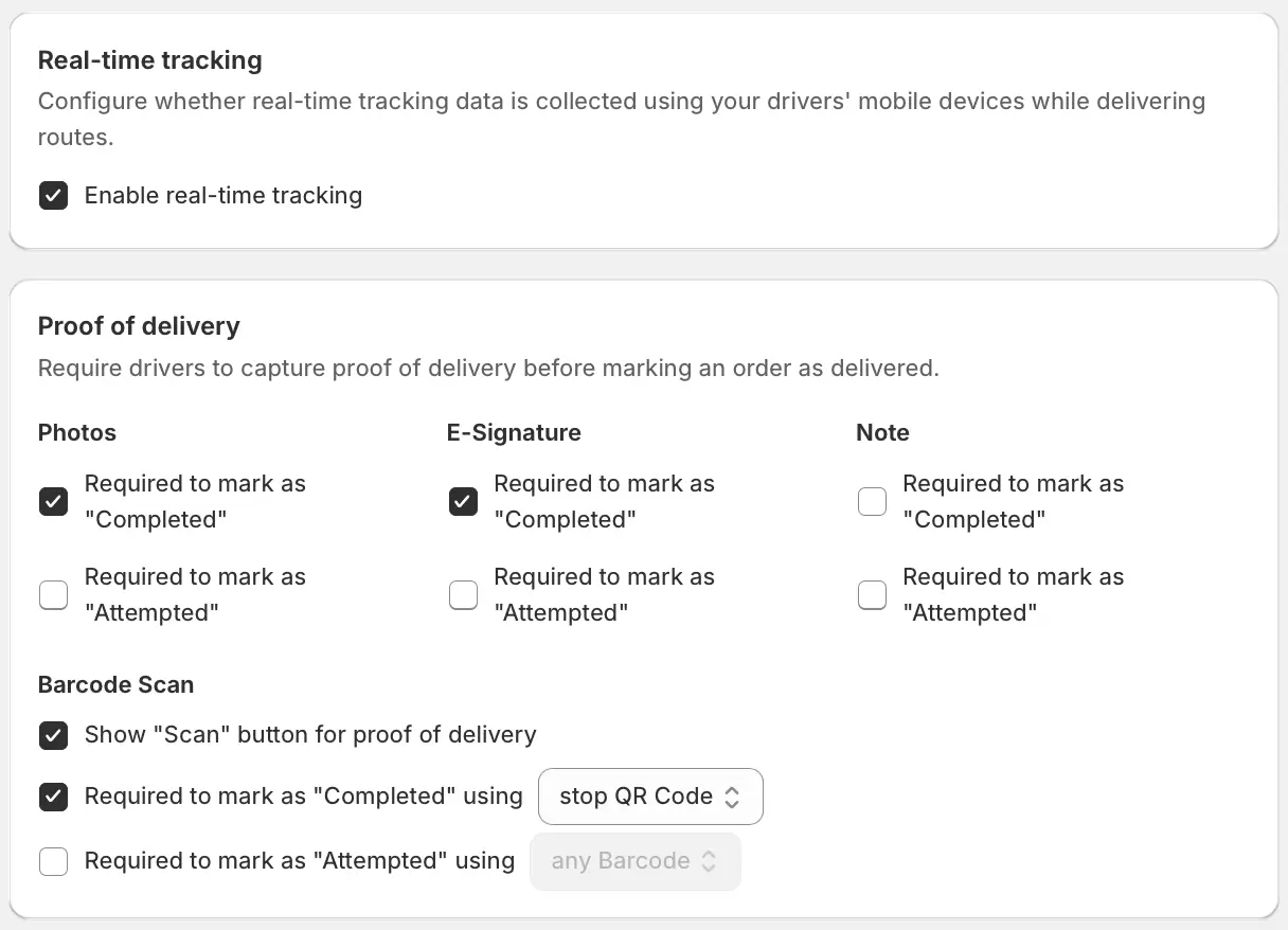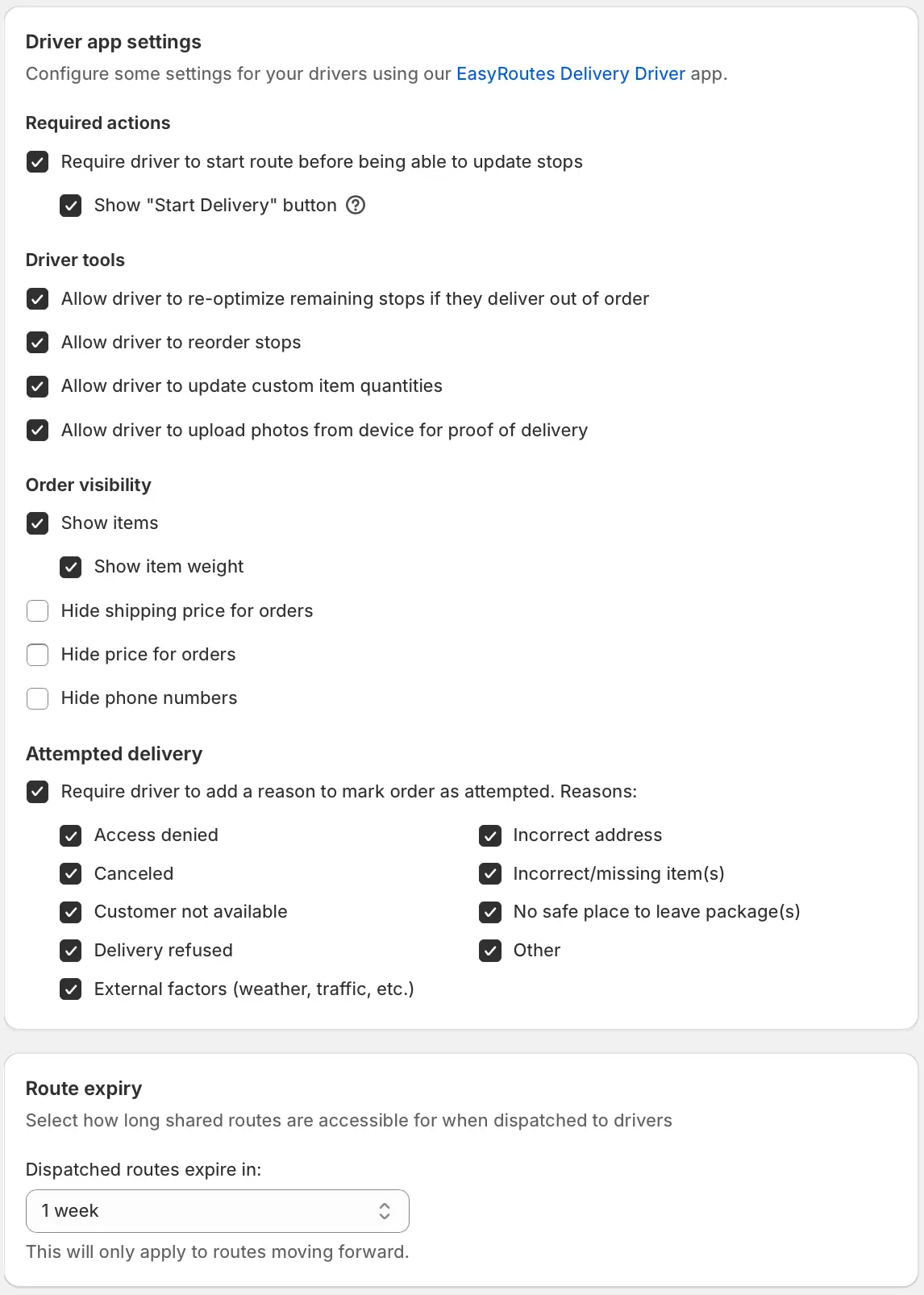 Driver app settings: These settings determine what information drivers will have access to, and what additional route permissions/activities they can perform via the mobile app: