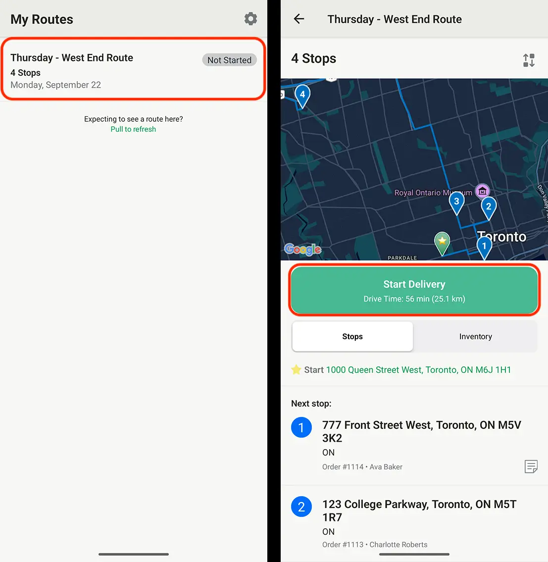 This route will also be added to your list of routes on the mobile app's homepage, along with any other routes that are assigned to you - tap any route in the listing to access it, then tap Start Delivery to begin delivering a route: