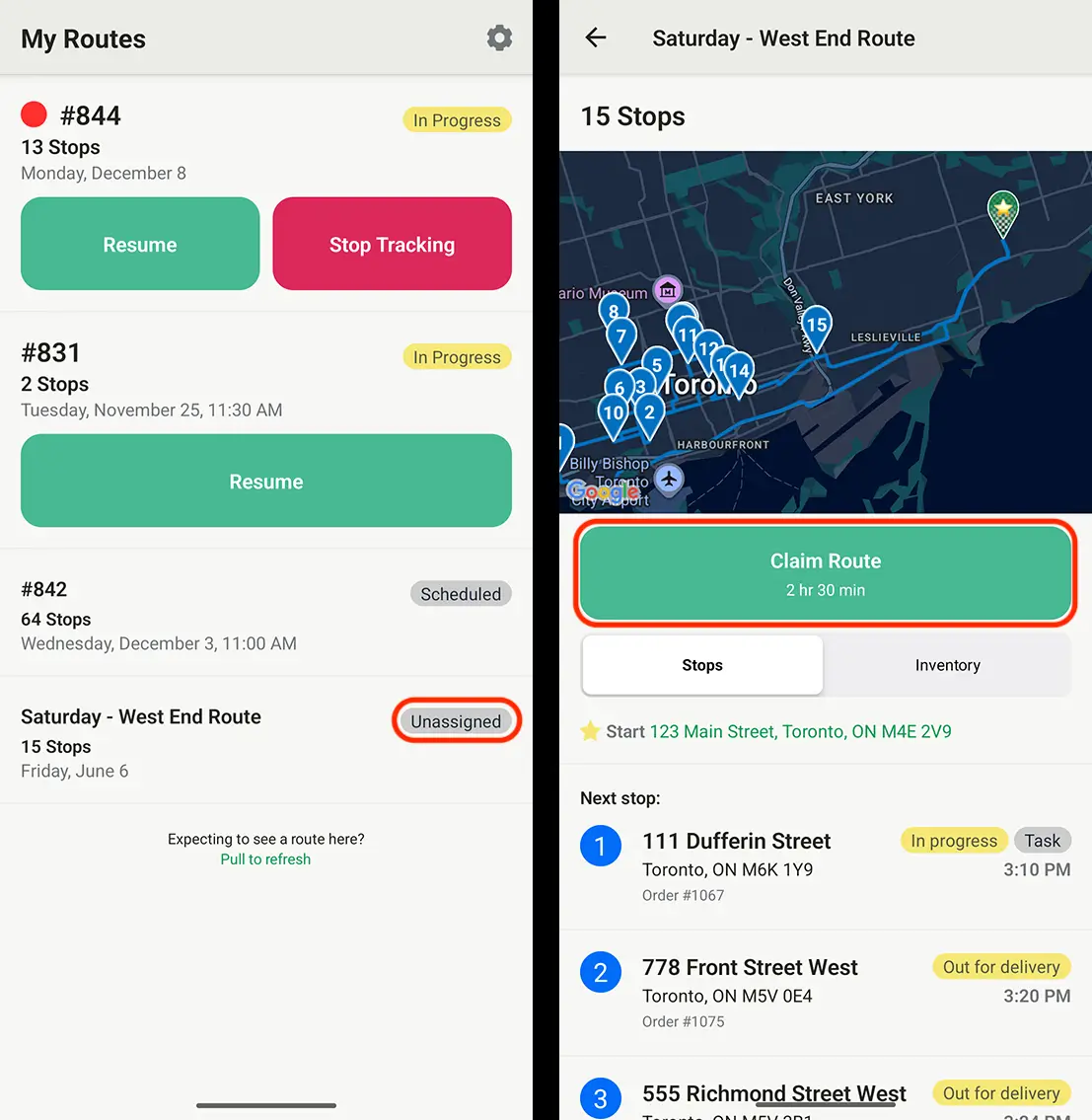 If any routes have been dispatched without an assigned driver, you may also be given the option to claim them. If any unassigned routes (indicated via the Unassigned badge below, left) are listed in your app, tap on one, then Claim Route to self-assign yourself to that route: