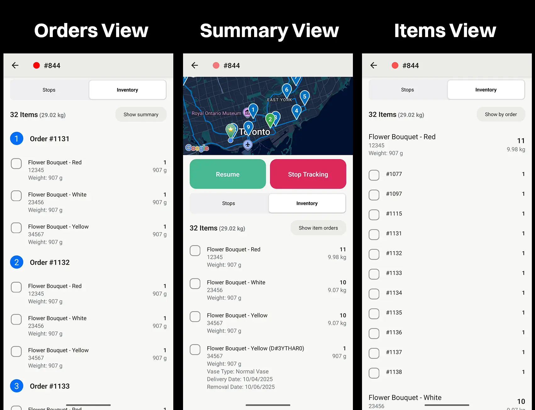 EasyRoutes generates an inventory for each route that can also be used as a packing checklist before departing for deliveries. This inventory provides an overview of every item needed for the entire route, as well as individual stops. When viewing a route, scroll down below the map and tap the Inventory slider - you'll have three options for displaying inventories:
