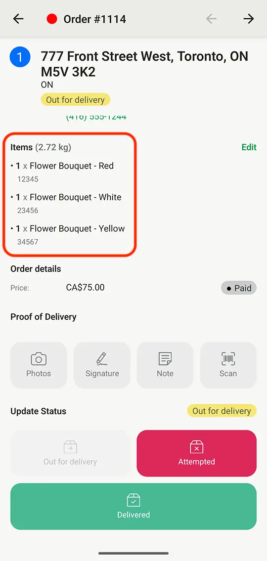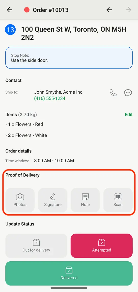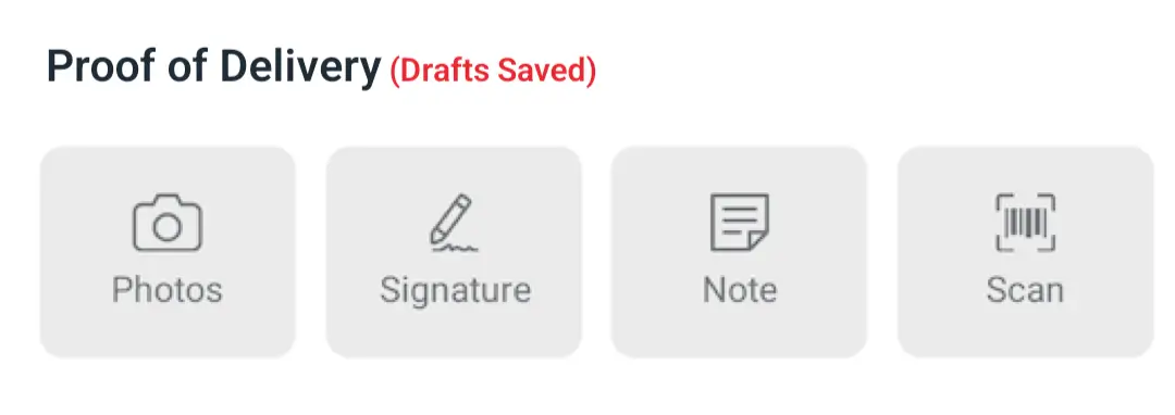 Before marking an order as Attempted or Delivered, you can optionally include Proof of Delivery via photo capture, eSignature, a custom note indicating any additional details about the delivery, or a barcode scan. These Proof items can be used for record keeping or additional confirmation for merchants, but can also be shared with your customers to provide additional peace of mind regarding their deliveries.