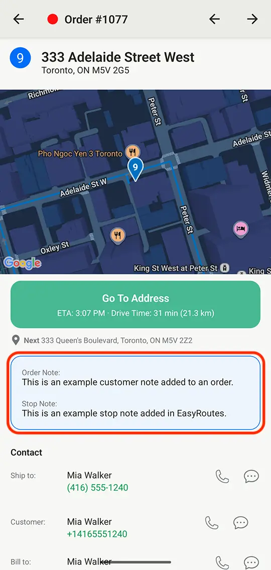 Any available Order notes, Stop notes and/or Customer notes associated with the stop will be listed below the map: