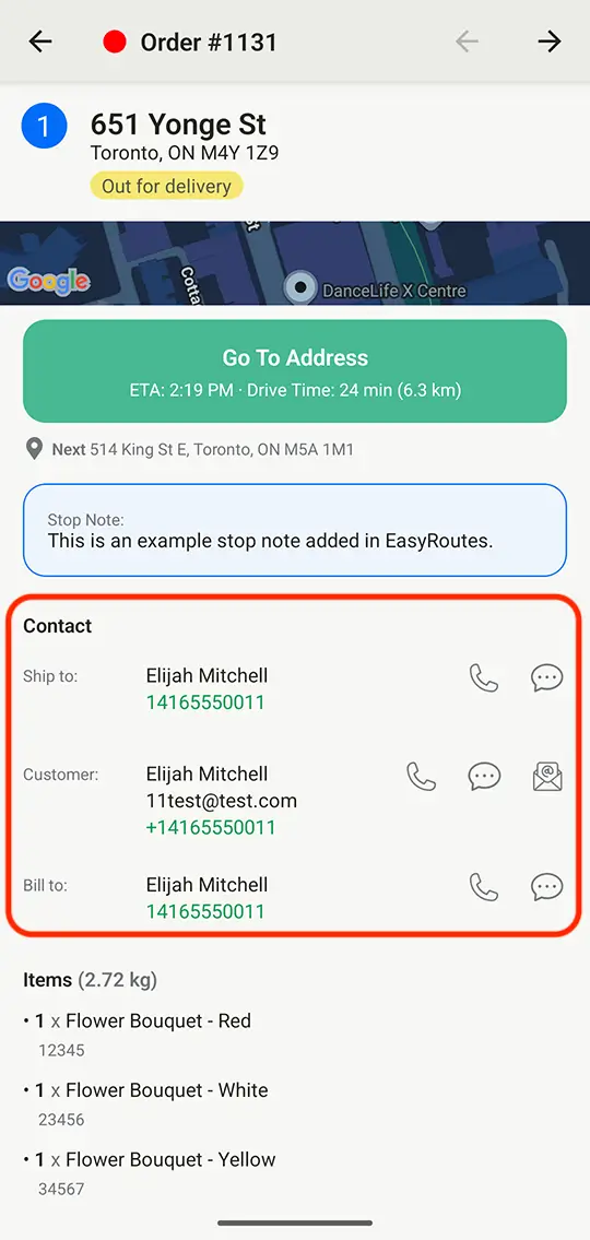 Any applicable recipient and customer information will be listed next, with shortcuts to contact them by call, text, or email if required: