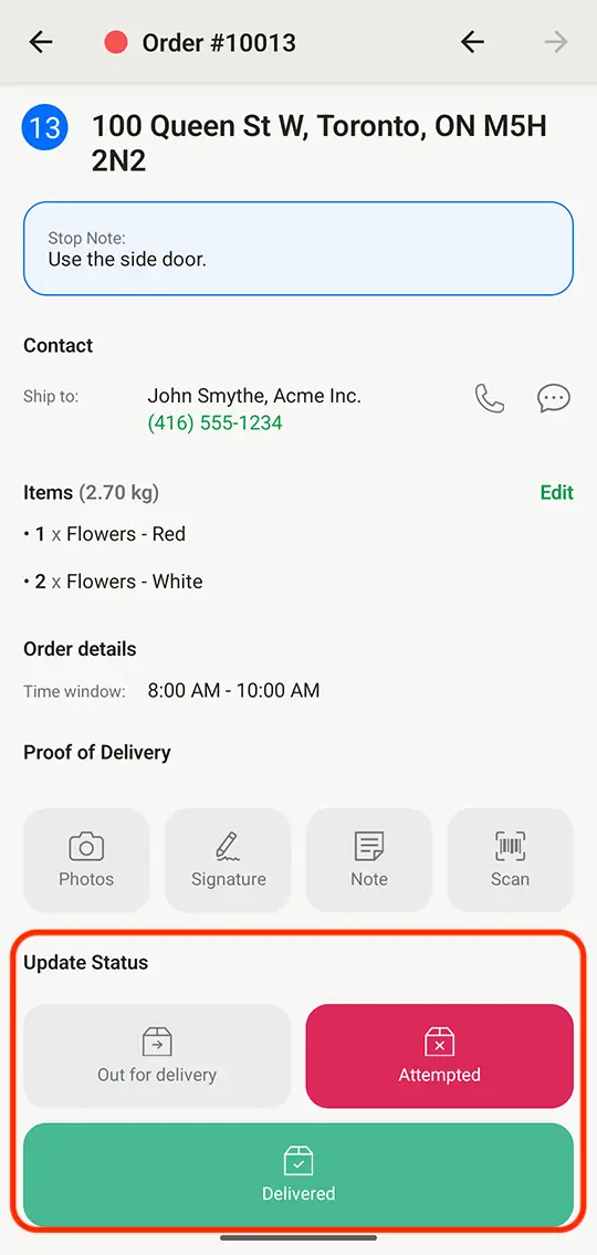 Just below the Proof of Delivery tools, you'll find the Update Status section - tap the applicable button to mark the stop as Attempted or Delivered, and the app will prompt you to move on to the next stop in your route: