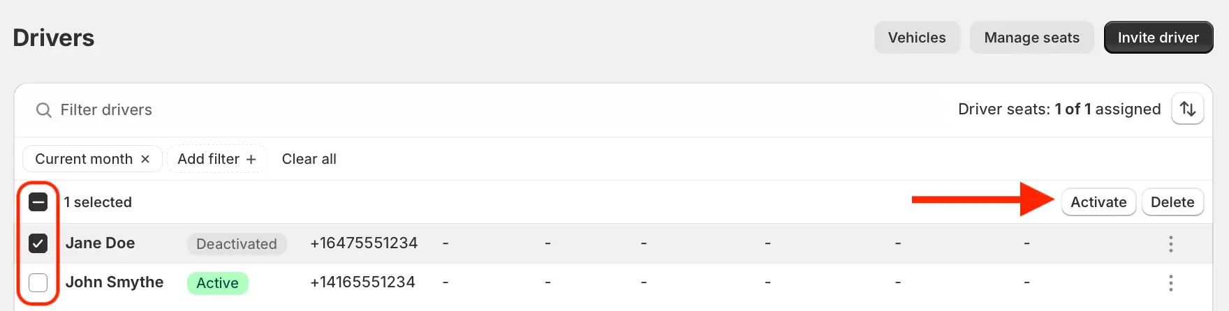 From the Drivers & Vehicles tab, select the driver(s) you want to activate by clicking the checkbox next to their name(s). This will pop up the Actions menu in the upper right-hand corner of the table; click the Activate button: