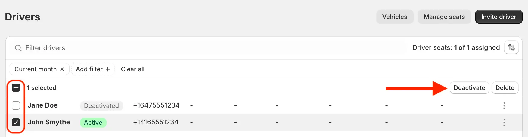 From the Drivers & Vehicles tab, select the driver(s) you want to deactivate by clicking the checkbox next to their name(s). This will pop up the Actions menu in the upper right-hand corner of the table; click the Deactivate button:
