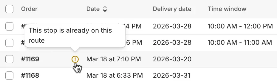 When adding orders to an existing route from a route's Add orders tab, any orders that are already included on the current route will display in the orders table with a warning badge:
