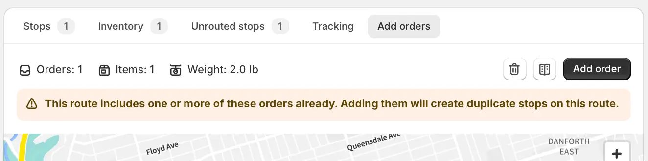 If any duplicate orders are added to the map from the Add orders tab, a new warning banner will display directly above the map: