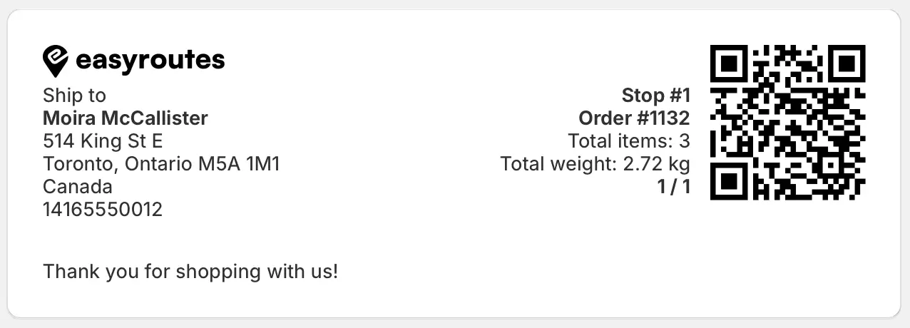 Route planners can include barcodes on packing documents (as shown above) from their EasyRoutes Settings > Packing Slips & Labels tab, by enabling the Show QR code checkbox for each document, and configuring the code's positioning. Once enabled, drivers can be required to validate barcode scans in order to mark a stop as Completed and/or Attempted from the EasyRoutes Settings > Driver Settings tab.