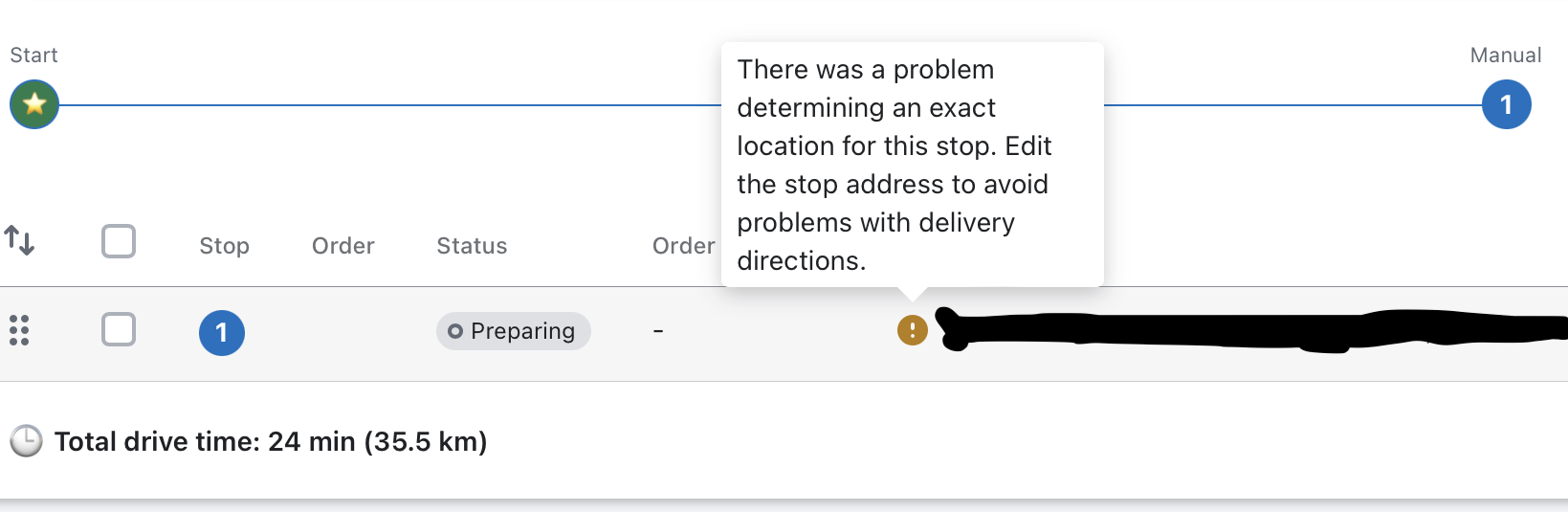 Show a warning if there is an address on a route when we are unable to determine an exact address match for this stop: