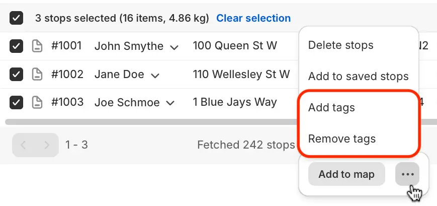 Note: This new bulk action applies only to stops imported into EasyRoutes via CSV file, the EasyRoutes API, or Zapier import stops action. We recommend taking advantage of Shopify's native bulk tagging feature to add/remove tags for Shopify orders, which will automatically sync into the EasyRoutes Orders page for applicable orders.