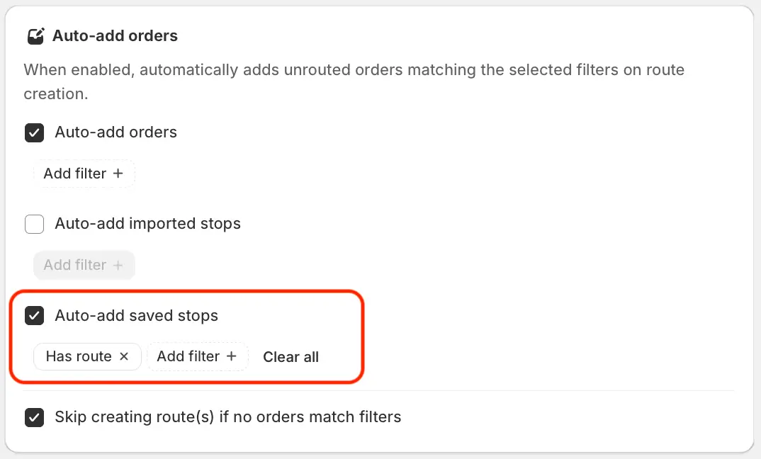 We've added a new option to the Auto-add orders panel when configuring EasyRoutes Workflows, allowing route planners to include saved stops stored in the Address Book when auto-generating recurring routes. When enabled, this option will select both unrouted and already routed saved stops by default - particularly useful for including recurring pickups or deliveries that must take place on every route, even if they've been visited on previous routes. Ensure the Route > Not routed filter type is applied to only include stops that have not been added to a route before.